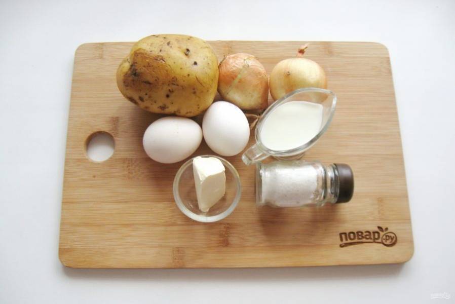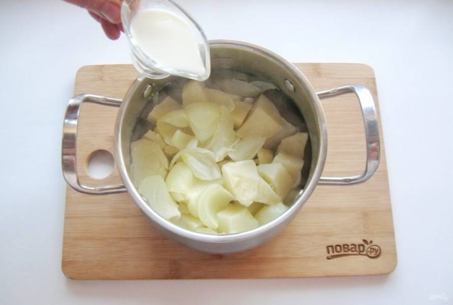 Добавьте мускатный орех по вкусу и разомните лук с картофелем, молоком и сливочным маслом в пюре.