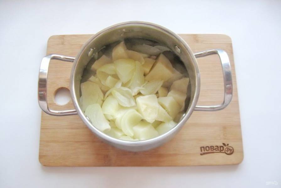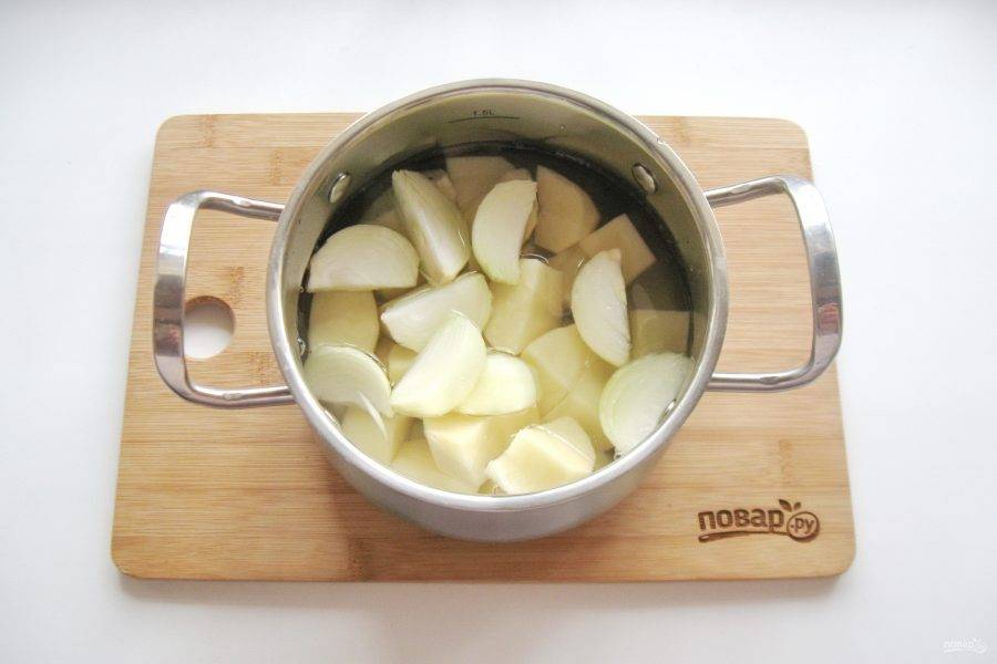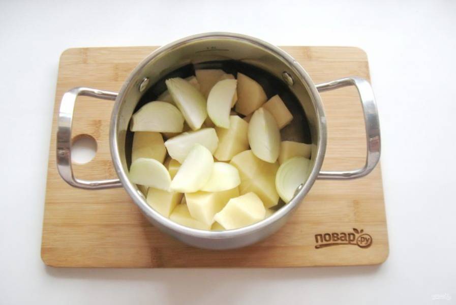 Лук очистите, помойте и нарежьте крупно. Добавьте в кастрюлю с картофелем.