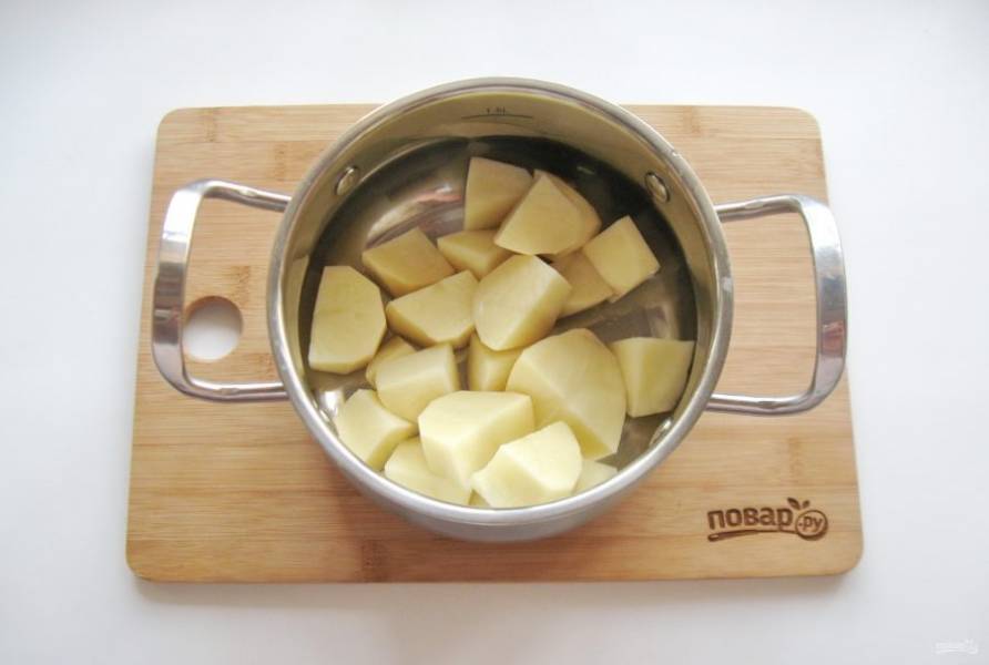 Картофель очистите, помойте и нарежьте крупными кусочками. Выложите в кастрюлю.