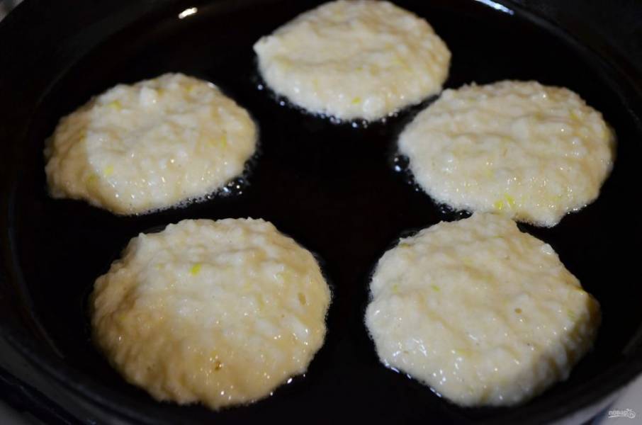 8. Разогрейте растительное масло на сковороде. Столовой ложкой набирайте тесто и выкладывайте на расстоянии друг от друга. Жарьте буквально по минутке с каждом стороны, тесто отлично прожаривается внутри, оладьи пористые и нежные.
