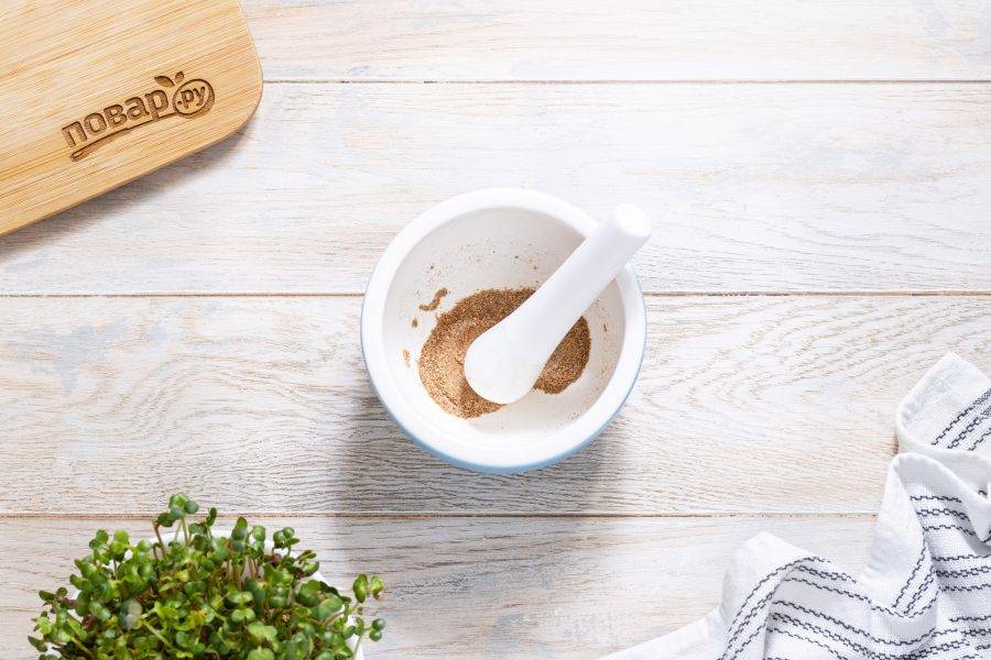 Прогрейте на сухой сковороде семена тмина, затем разотрите в ступке вместе с молотым чили и солью.