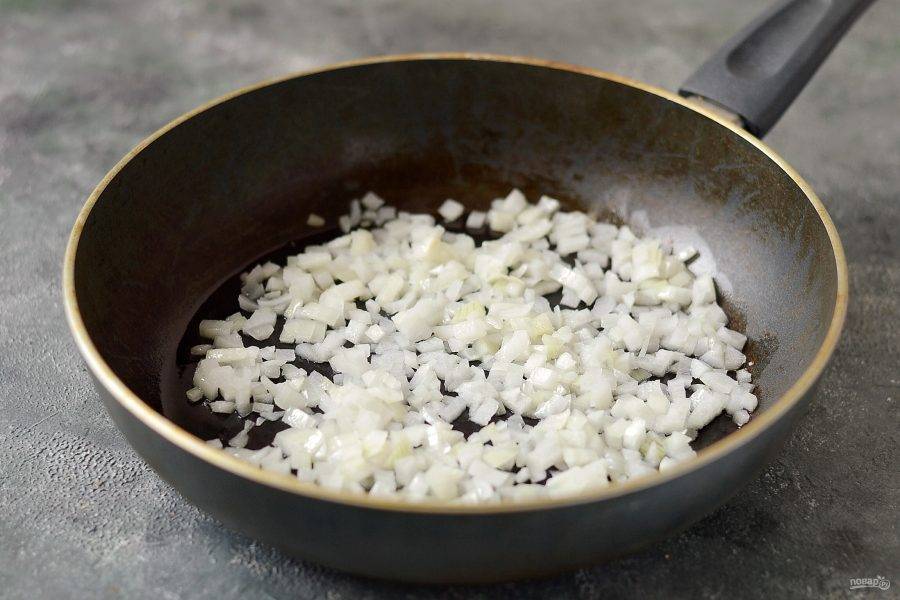 Репчатый лук нарежьте на мелкие кубики. Обжарьте в сковороде до золотистого цвета.