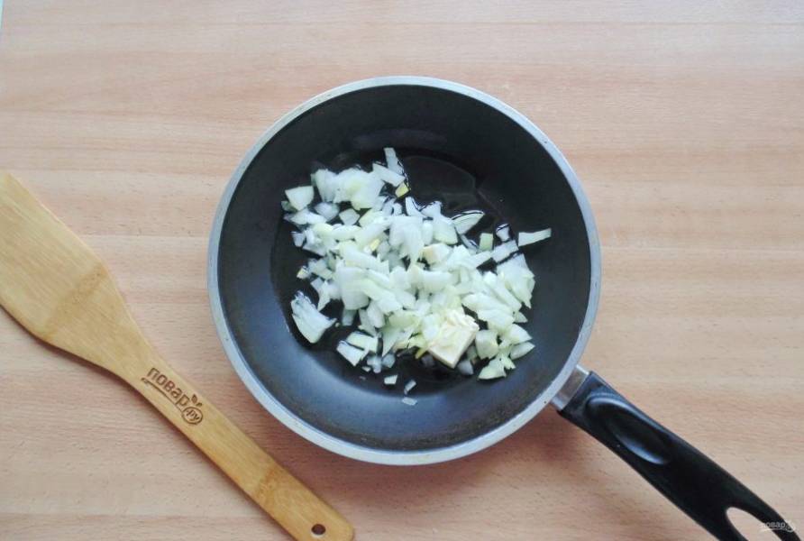 Репчатый лук очистите, помойте и мелко нарежьте. Выложите в сковороду с маслом. Жарьте лук до прозрачности.