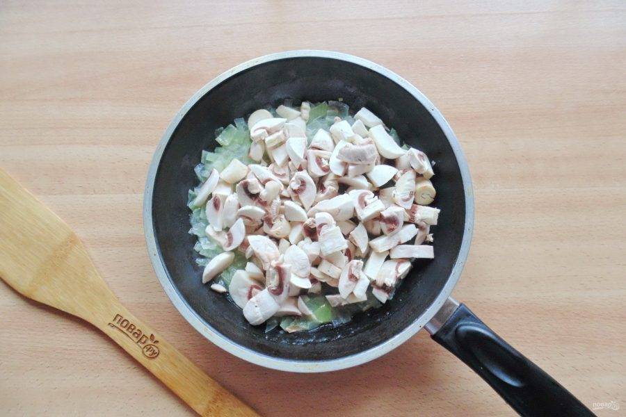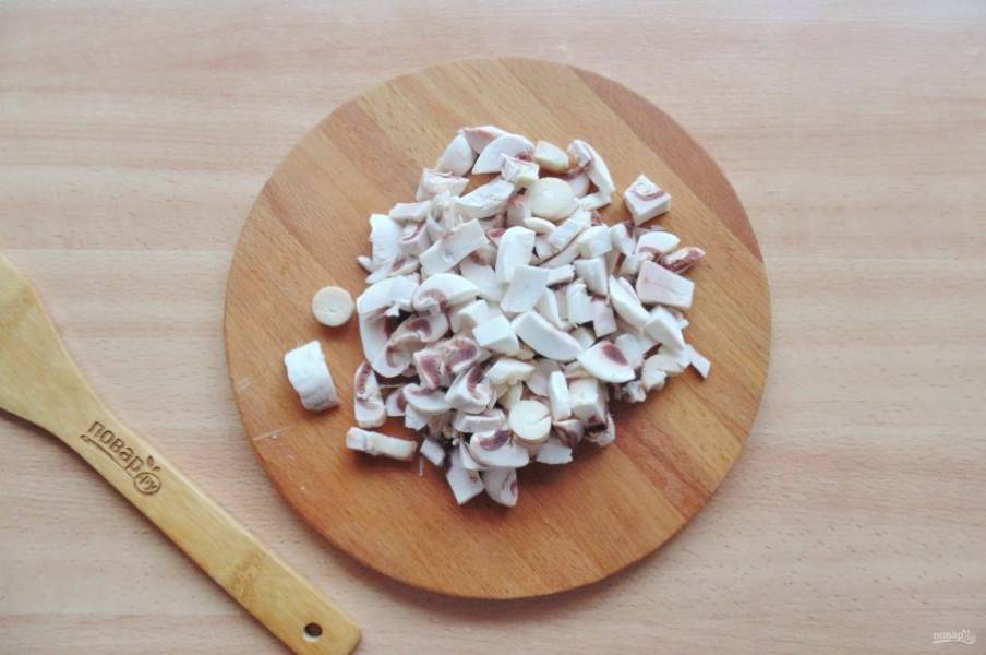 Шампиньоны очистите, помойте и мелко нарежьте.