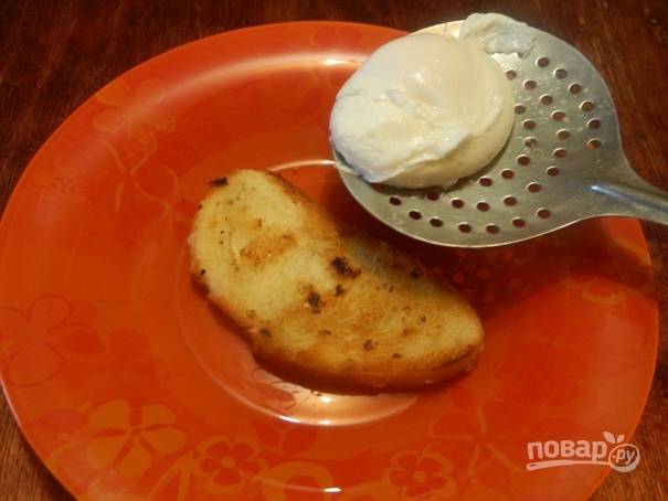 6. Варим яйцо минуту-две, а затем очень аккуратно достаем его шумовкой и выкладываем на гренку.