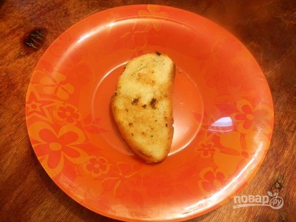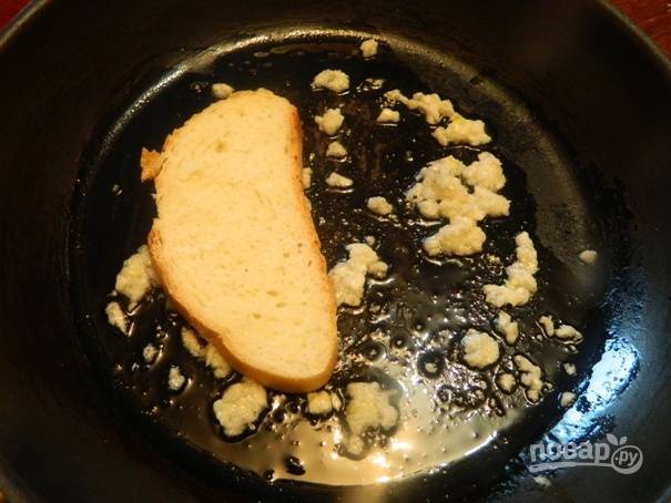 2. Разогреваем сковороду с растительным маслом, добавляем туда чеснок с солью. Затем выкладываем тонкие ломтики хлеба или батона, обжариваем его с двух сторон до золотистой корочки.