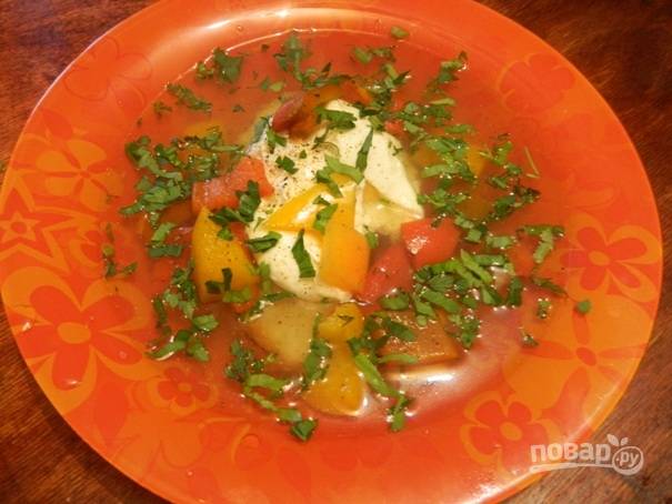 4. В кипящий бульон выкладываем порезанный на небольшие кусочки болгарский перец, варим 5-6 минут.