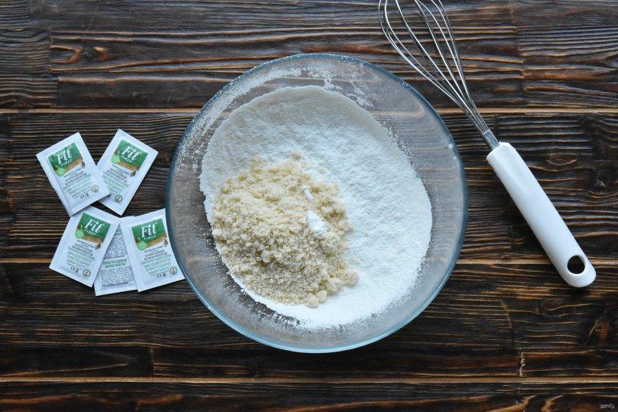 Соедините в миске сухие компоненты для безглютенового теста: муку миндальную, муку рисовую, сахарозаменитель, крахмал кукурузный. Перемешайте смесь венчиком.