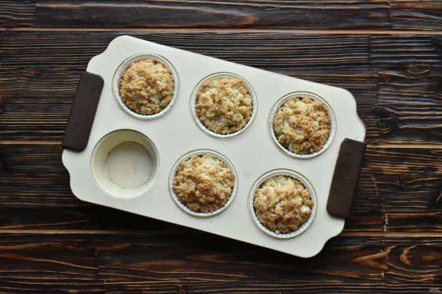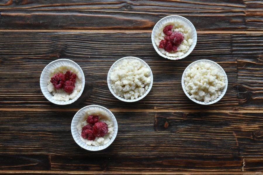 Подготовьте формы для выпечки маффинов. Заполните каждую небольшим количеством теста (1 ст.л.). Сверху выложите ягоды и накройте их оставшейся крошкой из теста.