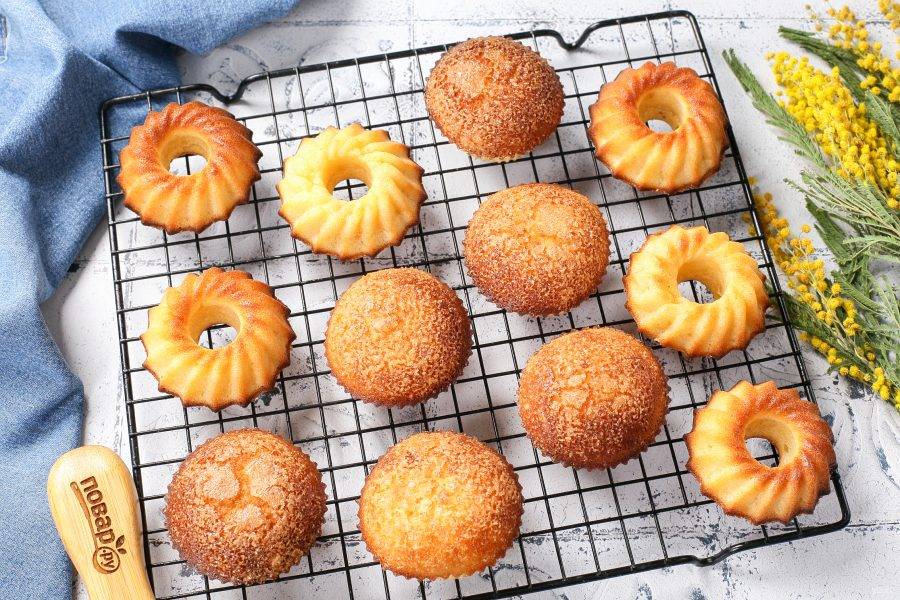 Выпекайте маффины 14 минут при температуре 220 градусов. Духовку сначала разогрейте до 250 градусов, а перед тем как поставить в неё кексы, опустите температуру до 220 градусов. На фото видно, что верхушка получается с хрустящей сахарной корочкой, а внутри нежный мякиш. Перед подачей остудите маффины на решётке.