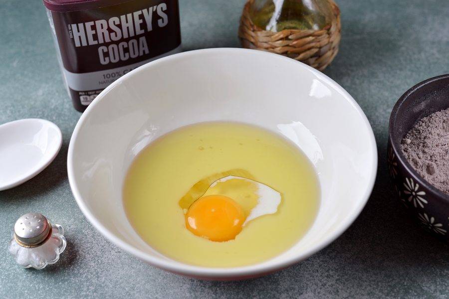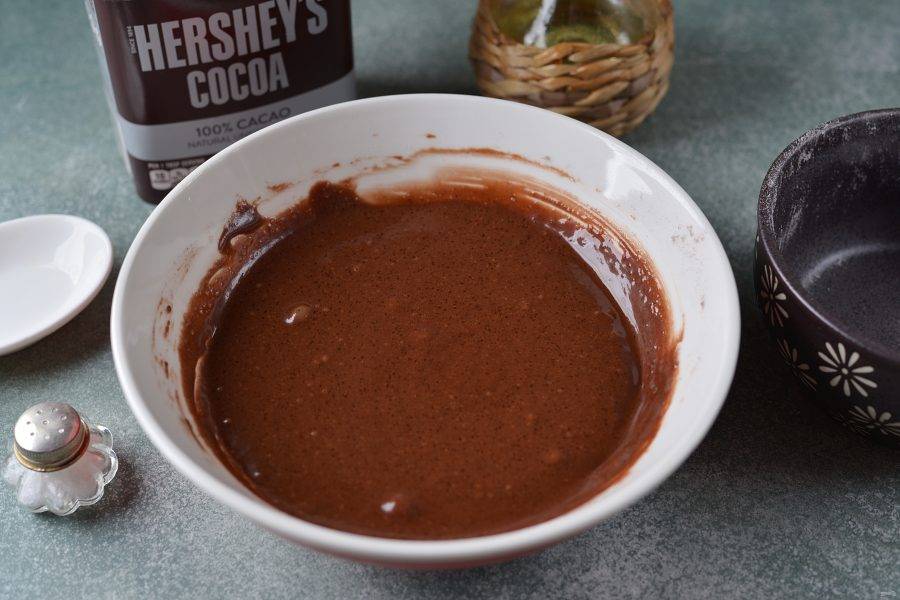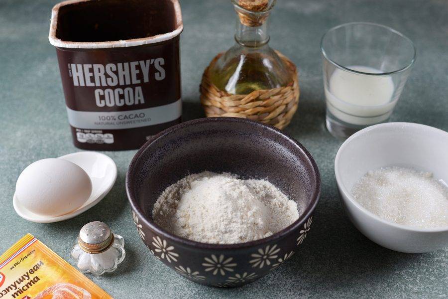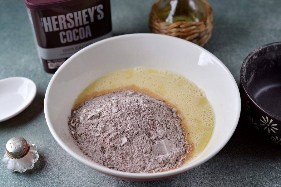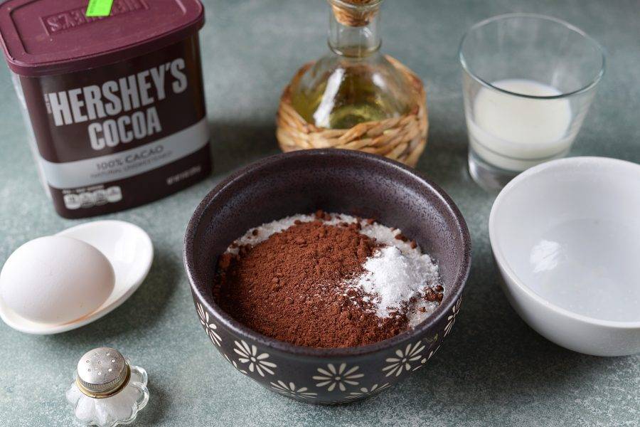 Сухие и жидкие ингредиенты смешивать нужно отдельно, поэтому отмерьте необходимое количество муки, какао порошка и сахара, добавьте соль и разрыхлитель.