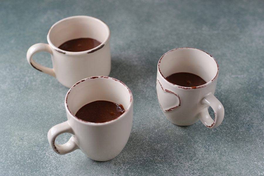 Разлейте тесто на 1/2 в небольшие кофейные керамические чашечки и поставьте в микроволновую печь на 2-2,5 минуты.