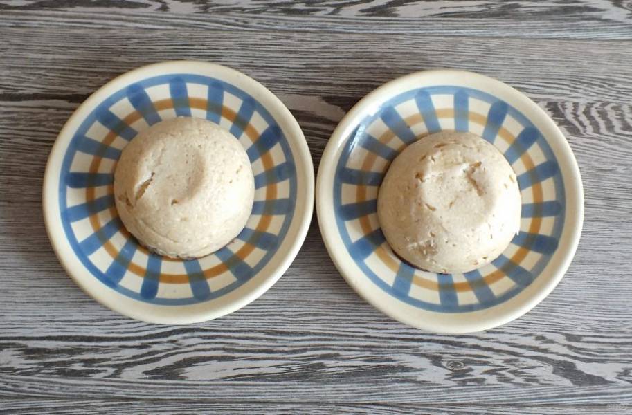 Выложите тесто с какао на белое тесто. Разровняйте. Поставьте в микроволновку при мощности 800 Вт на 4 минуты.