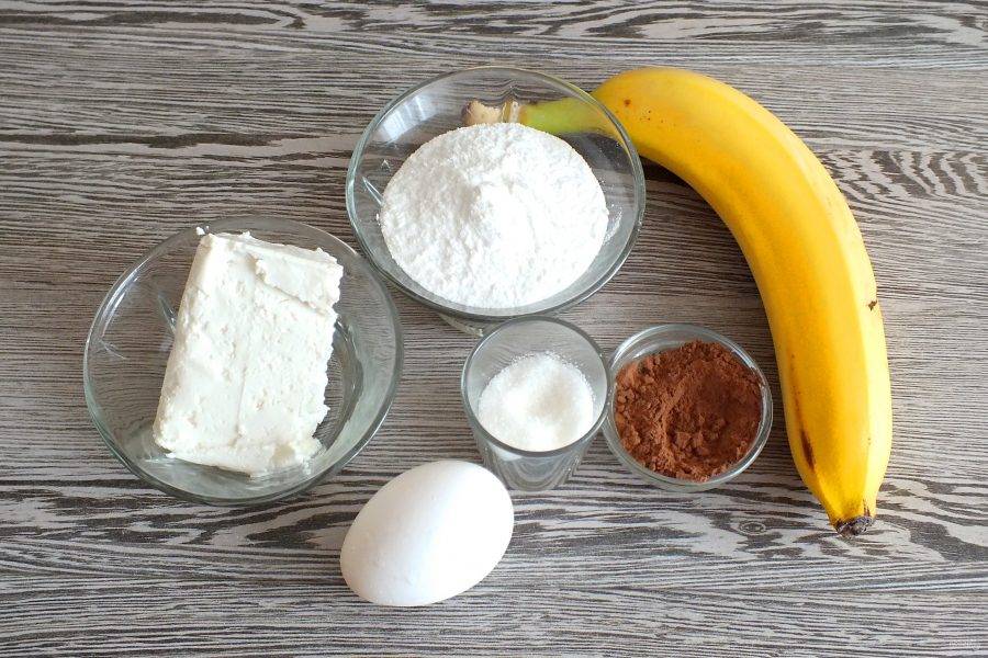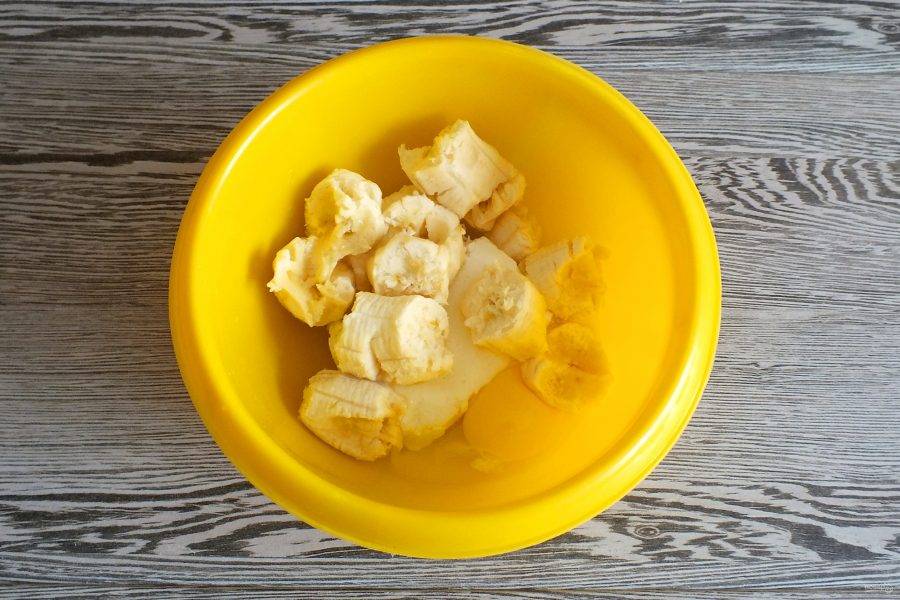 В чаше соедините банан, творог, яйцо. Пробейте блендером до однородного состояния.