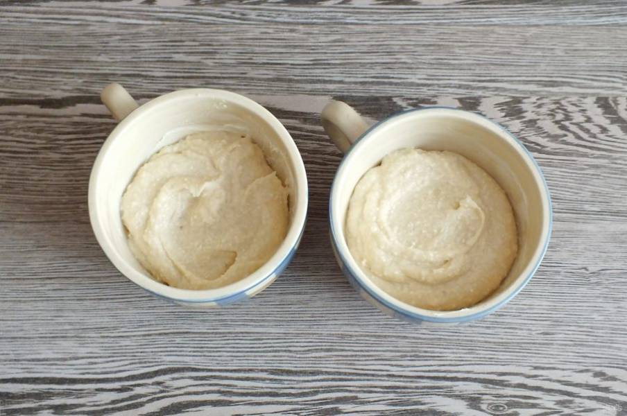 Возьмите чашки или формочки. Смажьте небольшим количеством сливочного масла. Разложите половину теста.