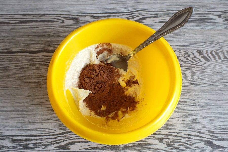 В оставшуюся половину теста добавьте какао. Хорошо перемешайте.