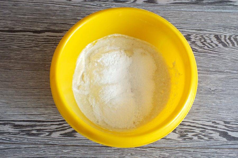 К полученной массе добавьте сахар, муку. Еще раз хорошо взбейте.