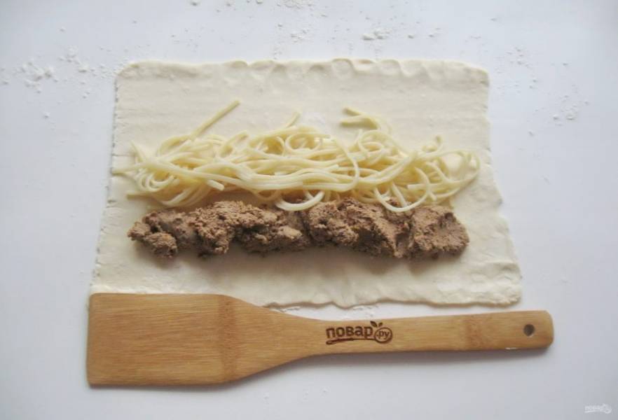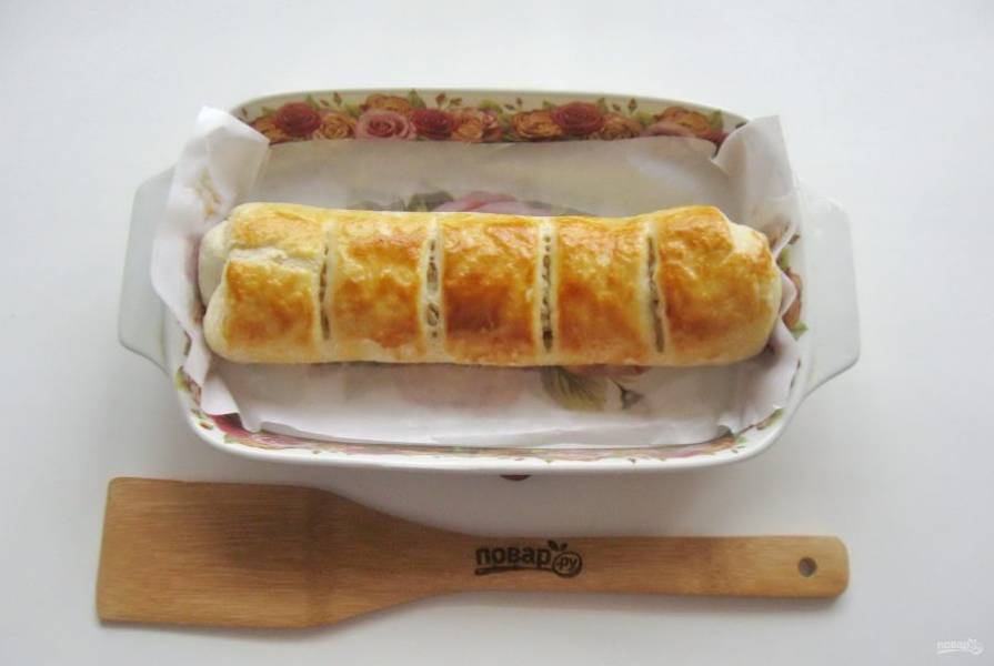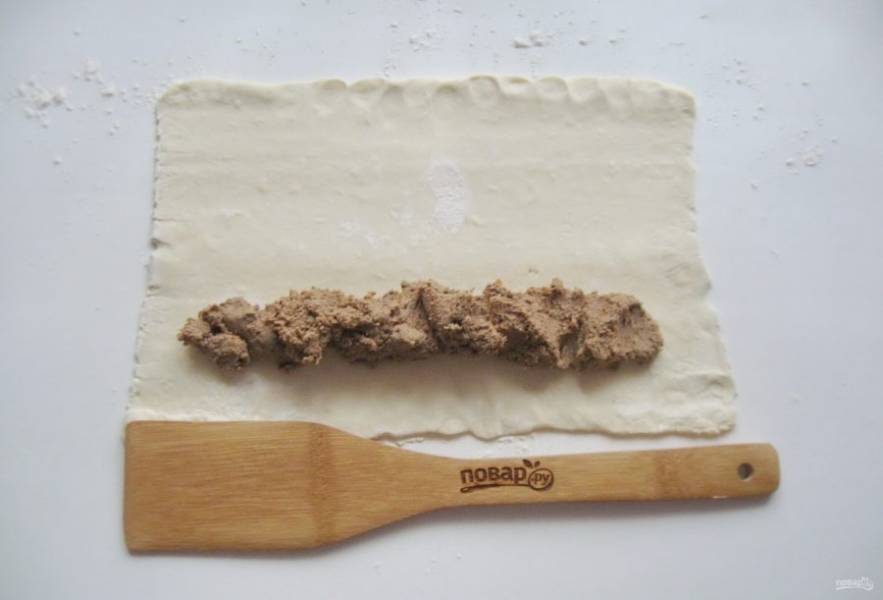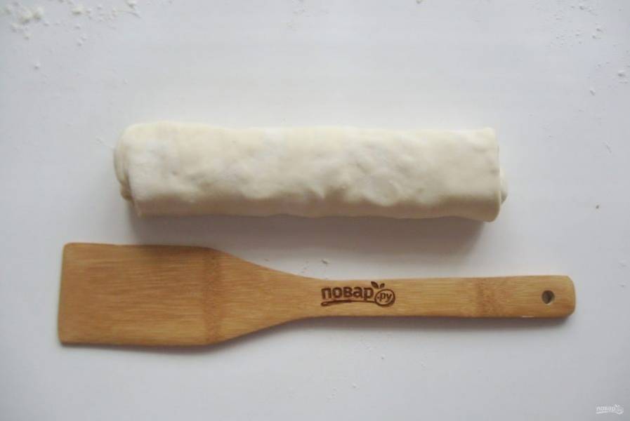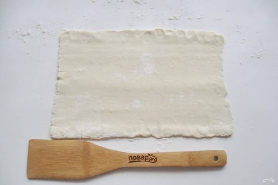 Слоеное тесто раскатайте в пласт толщиной 5-7 мм.