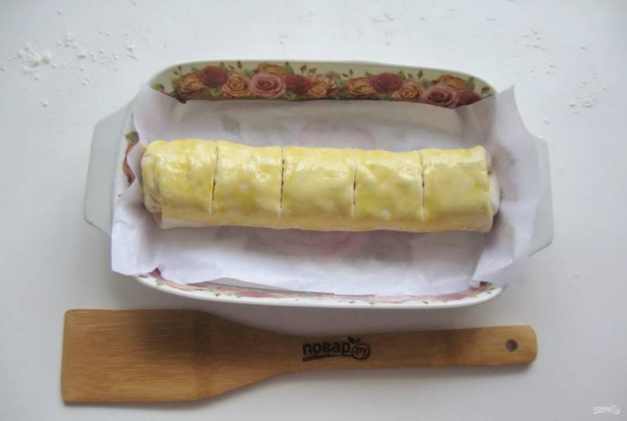 Смажьте взбитым яйцом. Слегка надрежьте пирог.