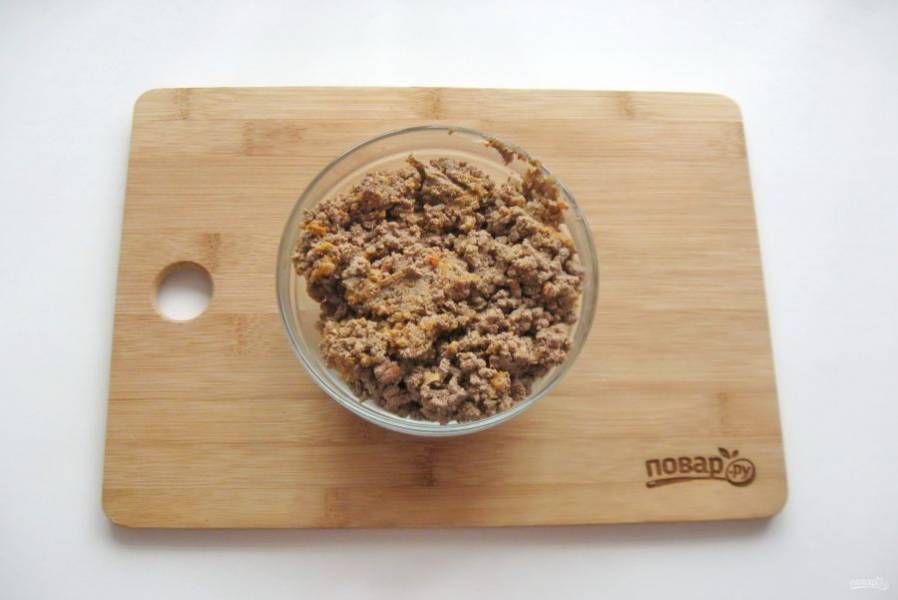 Пропустите через мясорубку жареную куриную печень, морковь и лук. Посолите и поперчите по вкусу.