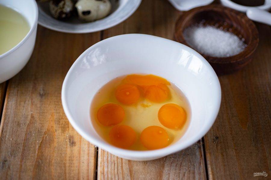 В отдельную мисочку для удобства вбейте перепелиные яйца.