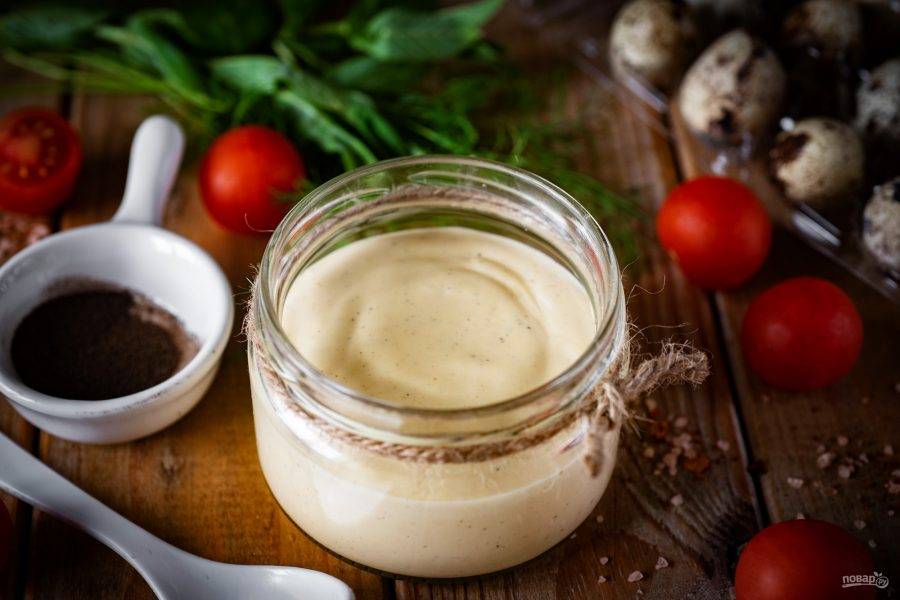 Готовый майонез уже можно использовать по назначению, а для хранения переложите его в удобную емкость с крышкой, например, в стеклянную баночку. Храните домашний майонез в холодильнике до 2-х недель.