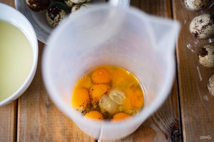 В удобный стакан для взбивания аккуратно выложите перепелиные яйца, добавьте горчицу, сахар, соль и черный молотый перец.