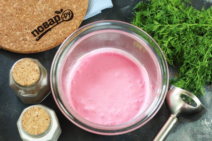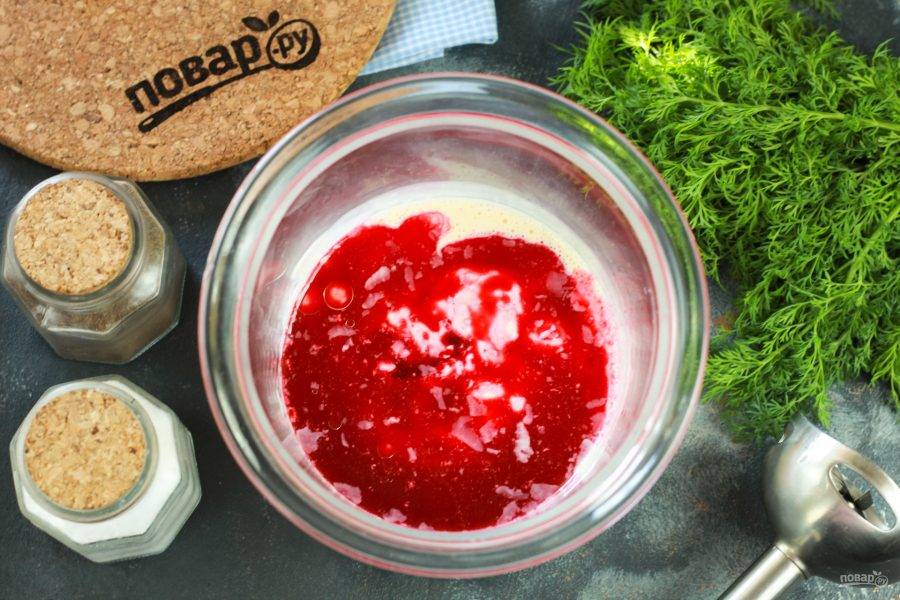 Затем натрите свеклу в салатник на мелкой терке и выжмите из массы сок. Добавьте его в майонез вместе с уксусом.