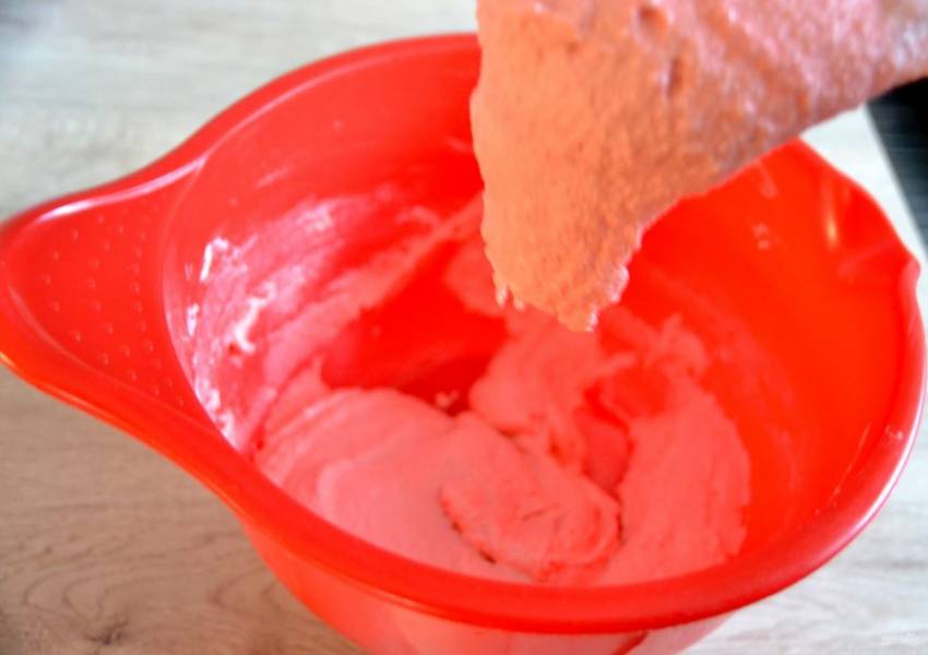 Смешайте в однородную массу, переложите подкрашенные белки в основную массу, смешайте все до однородности. Охладите до 32-35 градусов.