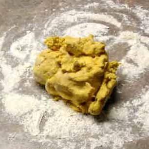 Посыпаем стол мукой. Обволакиваем тесто.