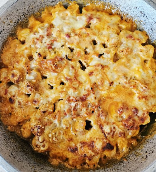 Приготовьте соус. Для этого смешайте сливки, сметану, соль, специи и сыр. Полученным соусом залейте макароны.