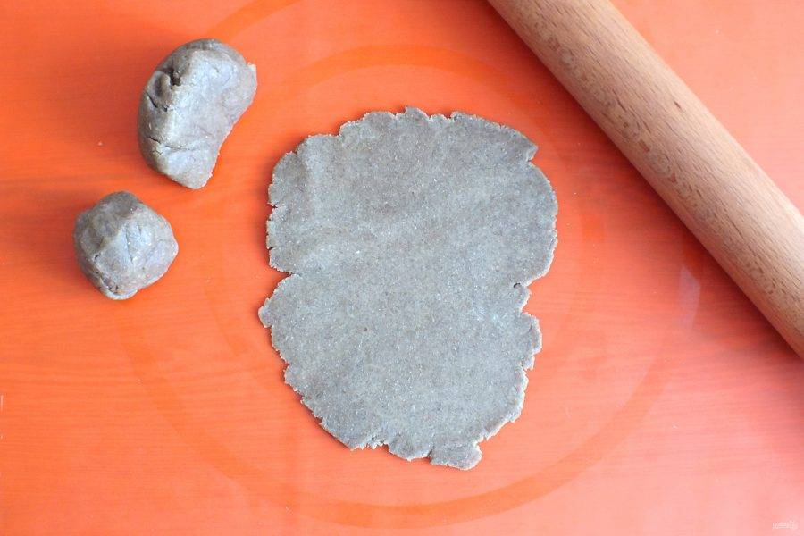 Готовое тесто должно получиться достаточно тугим. Разделите его на две части, потом каждую часть еще на две части. Возьмите одну маленькую часть и раскатайте ее как можно тоньше. Через пласт должна просматриваться немного рабочая поверхность.