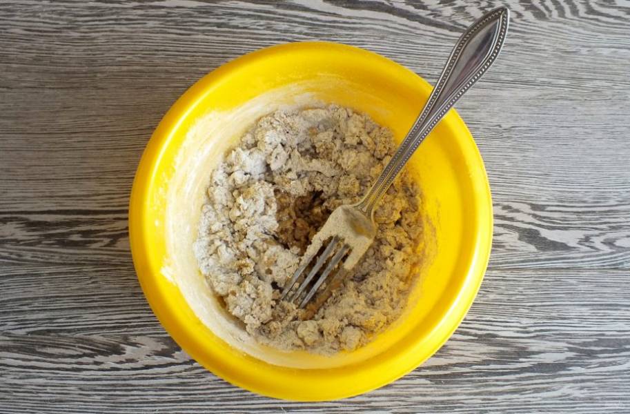 Добавьте растительное масло. Начните перемешивать вилкой, потом месите руками.