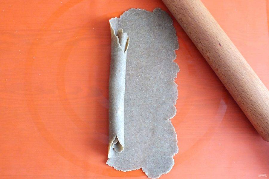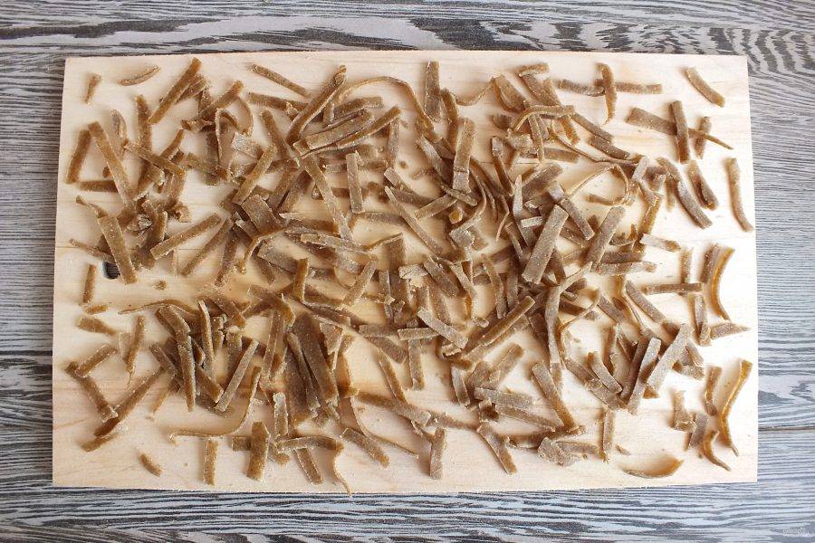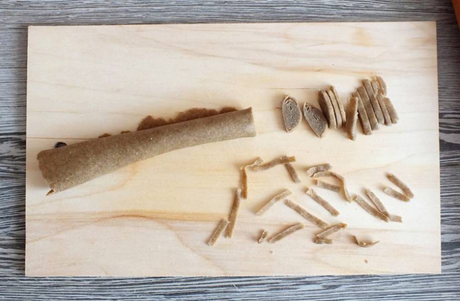 Нарежьте кусочками толщиной в пределах 0,2-0,3 см. Каждый кусочек раскрутите. Ленточки поломайте на макароны-лапшу.