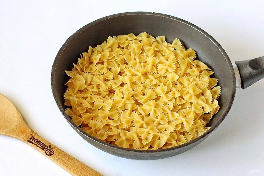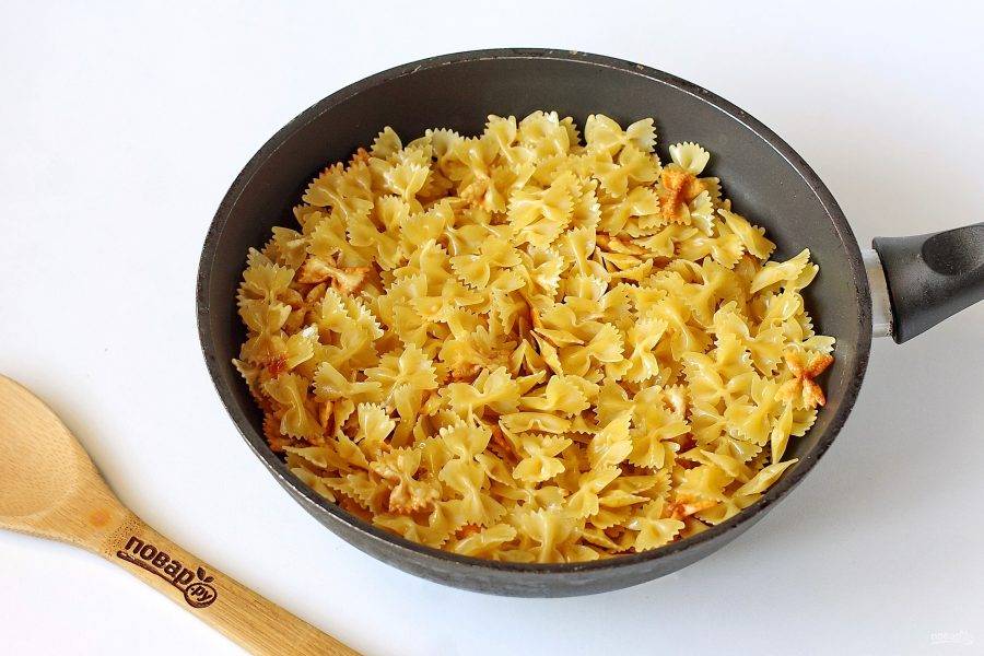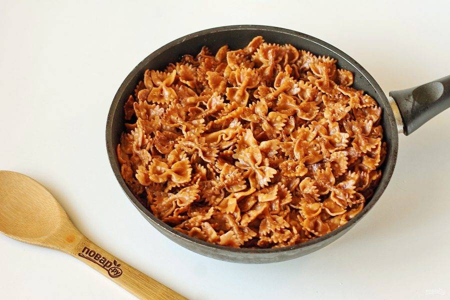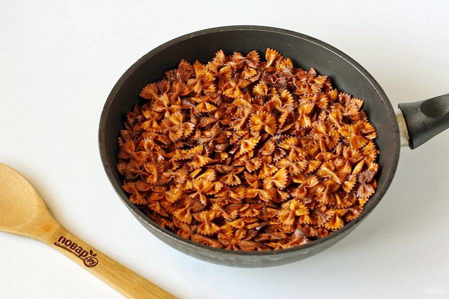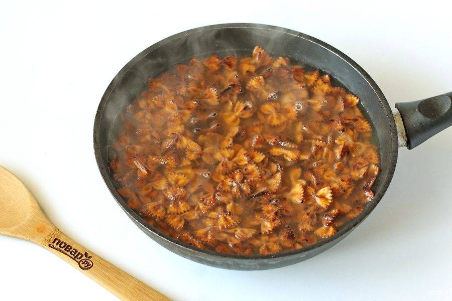 Обжаривайте макароны в течении 4-5 минут на среднем огне, постоянно помешивая (следите, чтобы макароны не подгорали).