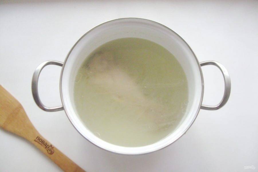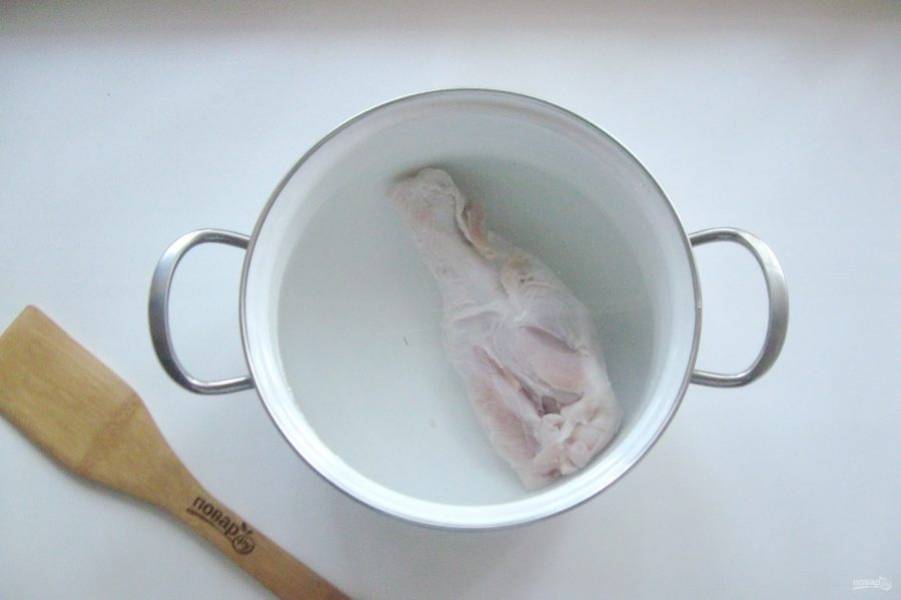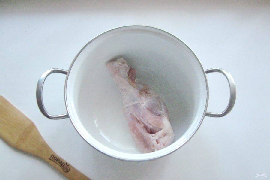 Варите индейку до мягкости. После достаньте из кастрюли, немного охладите и отделите мясо от кости и шкурки.