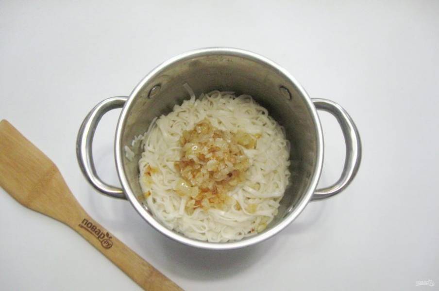 Налейте подсолнечное масло и поджарьте лук до золотистого цвета.