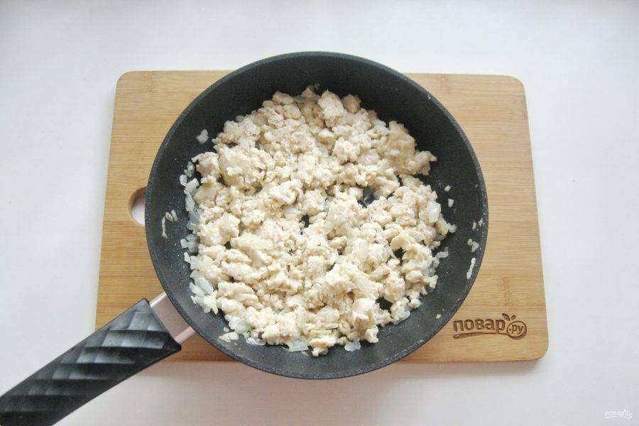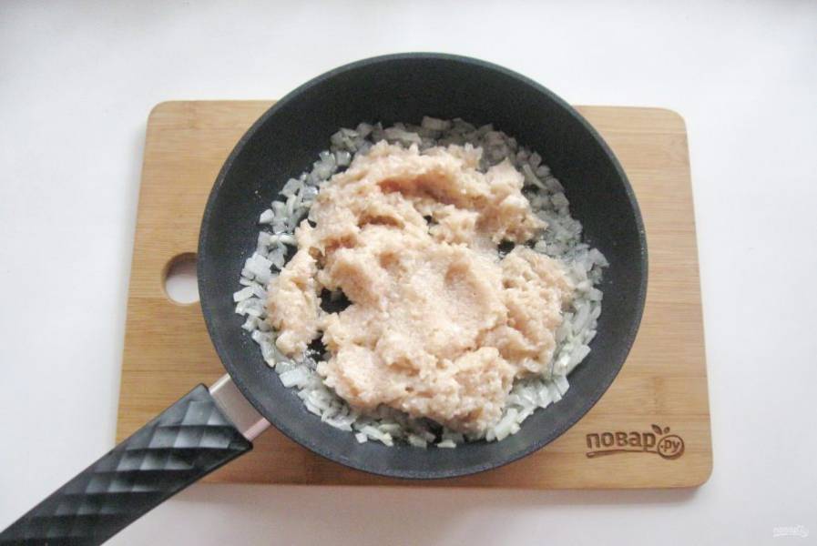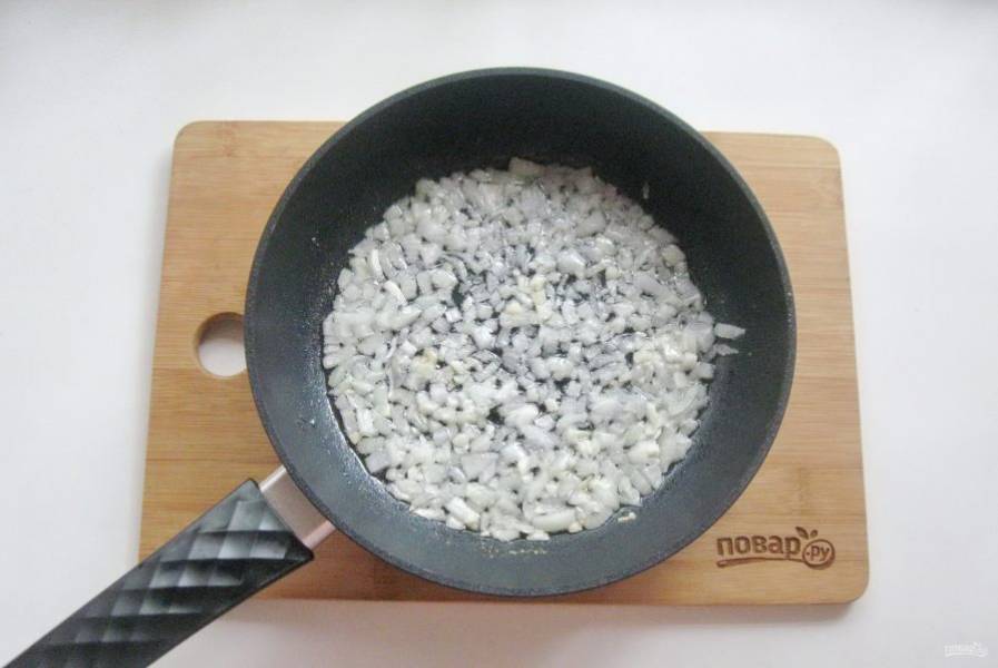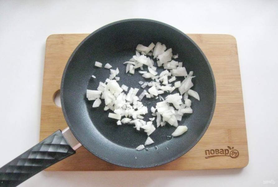 Репчатый лук очистите, помойте и мелко нарежьте. Выложите в сковороду.