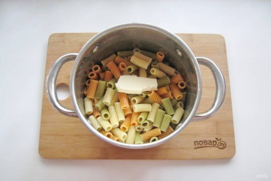 Пока фарш с луком жарится, отварите макароны. В кипящую, подсоленную воду выложите макароны и варите по инструкции на упаковке. Мне на это потребовалось 15 минут. После воду слейте, а макароны верните в кастрюлю. Добавьте сливочное масло и перемешайте.