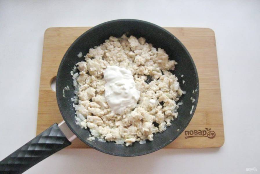 Затем добавьте сметану и перемешайте. Прогрейте фарш со сметаной еще 5-6 минут.