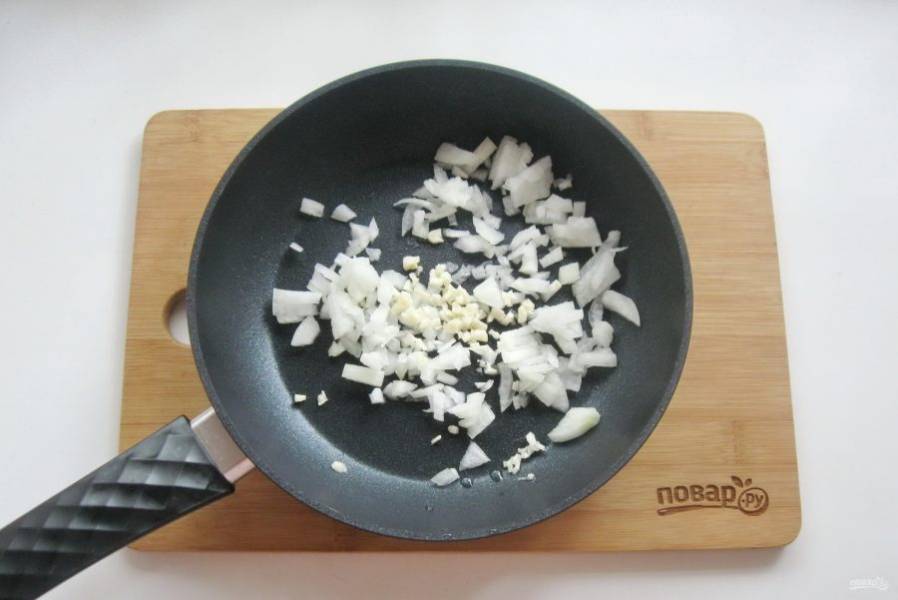 Налейте в сковороду подсолнечное масло и пассеруйте в нем лук с чесноком 7-8 минут. Сильно зажаривать не нужно.
