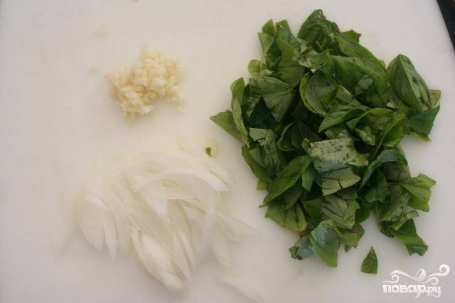 3. Базилик помыть, отряхнуть от сырой воды и порубить. Чеснок размять.