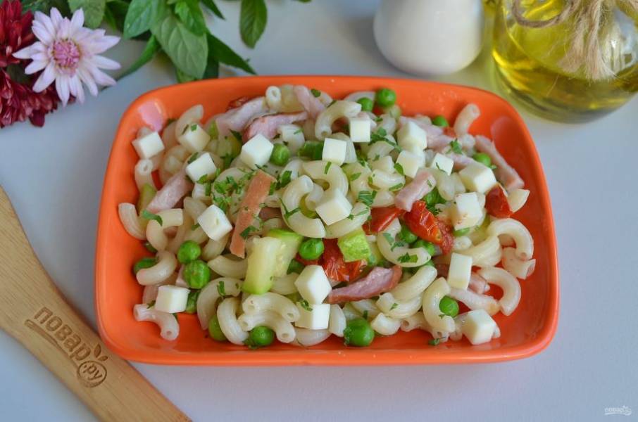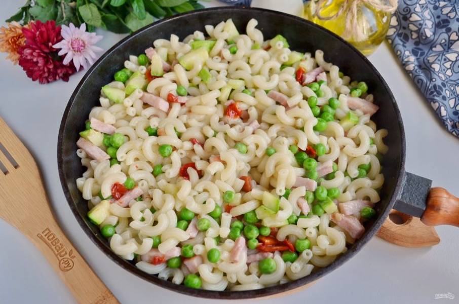 К овощам и ветчине добавьте готовые макароны, влейте 50 мл воды (в которой они варились) и прогрейте все, перемешайте. Снимите с огня и добавьте оставшееся оливковое масло.
