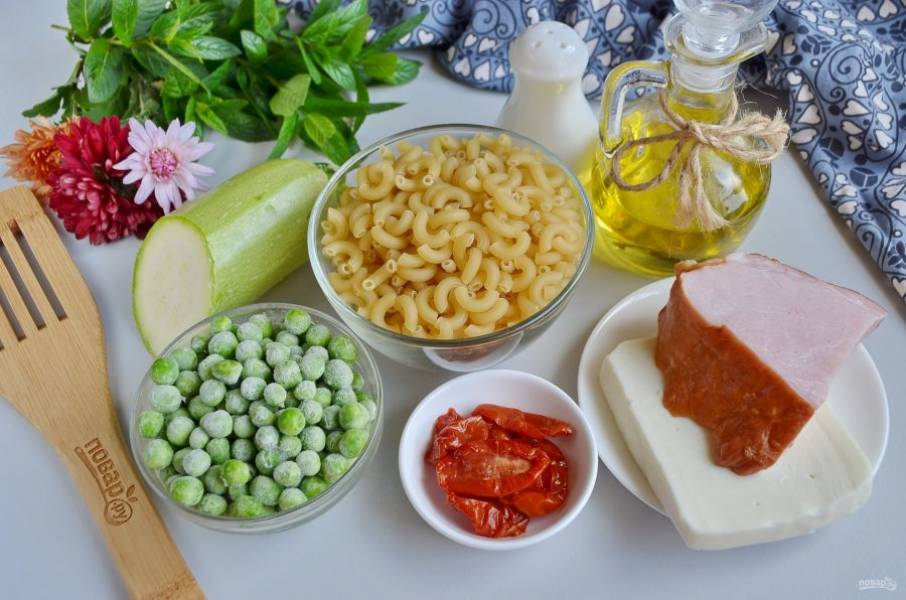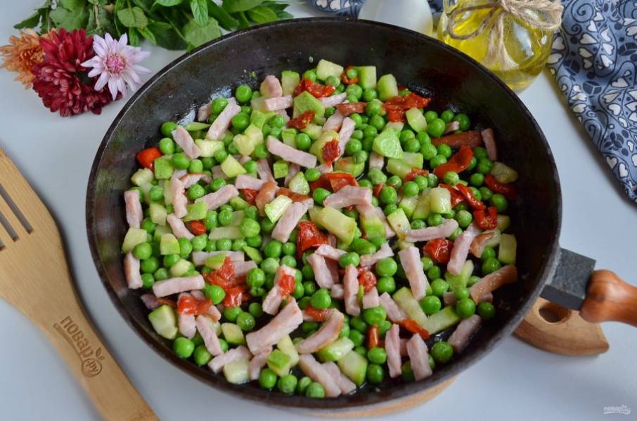 Разогрейте на сковороде 2 столовые ложки оливкового масла. Обжарьте ветчину. Добавьте цукини, вяленые помидоры, обжарьте. Зеленый горошек погрузите на минуту в кипяток, после чего сразу в ледяную воду (для сохранения цвета), потом положите в сковороду к остальным овощам и прогрейте, перемешайте.