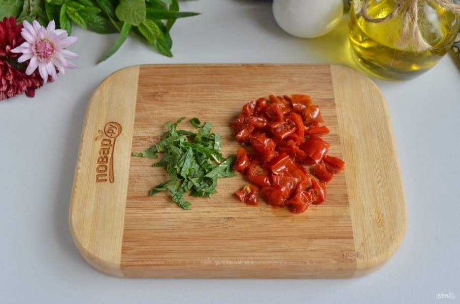 Вымойте мяту, обсушите её салфеткой и измельчите. Вяленые помидоры порежьте на 2-3 части.