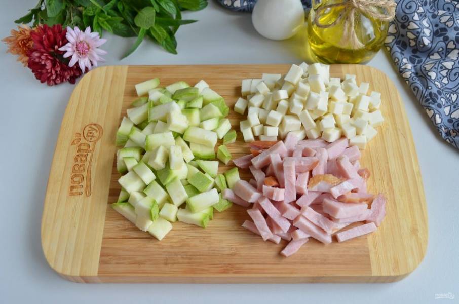 Порежьте небольшими брусочками или кубиками цукини, сыр, ветчину.