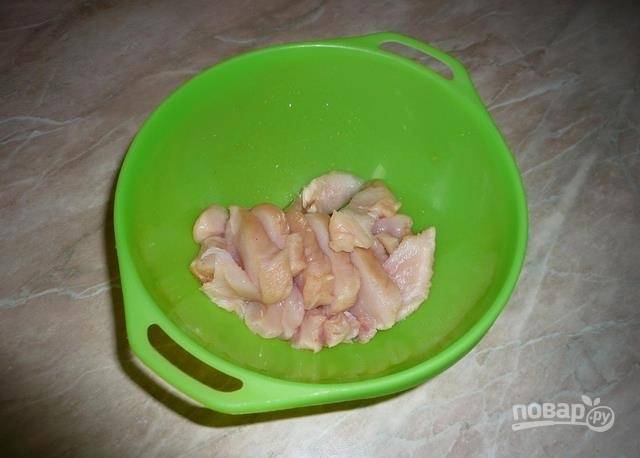 1. Куриное филе разрезаю крупно и кладу в пластиковый контейнер, вливаю соевый соус и доливаю воду, чтобы филе оказалось полностью в жидкости, мариную мясо 1 час, так оно не будет сухим.