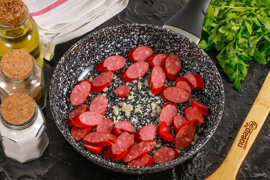 Чесночные зубчики очистите от шелухи и промойте в воде. Нарежьте мелко или спрессуйте через специальный девайс. Добавьте чесночную массу в сковороду, влив растительное масло. Поместите емкость на плиту и прогрейте. Нарежьте охотничьи колбаски ломтиками и добавьте в сковороду. Обжарьте примерно 2 минуты.