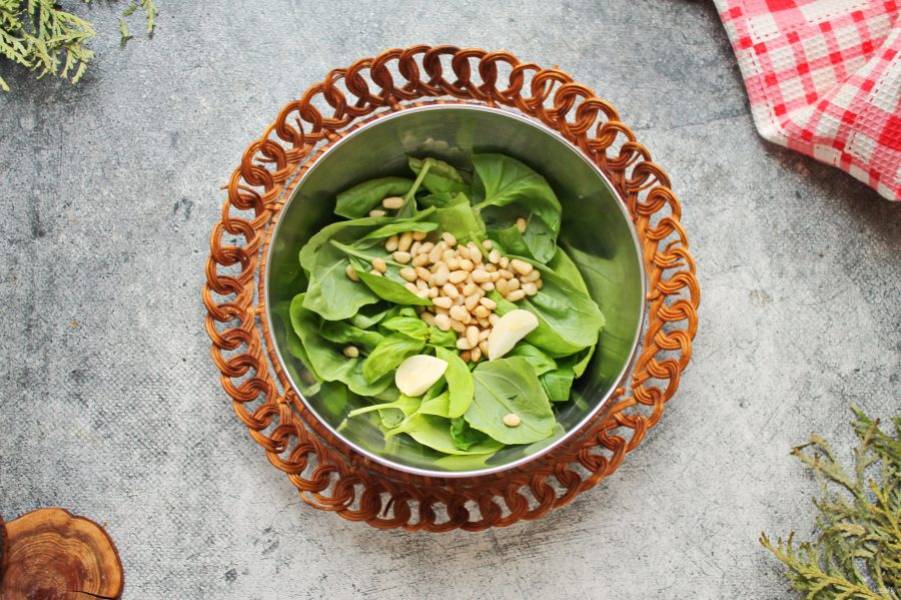 В миску выложите листья базилика, очищенный чеснок и все кедровые орешки.