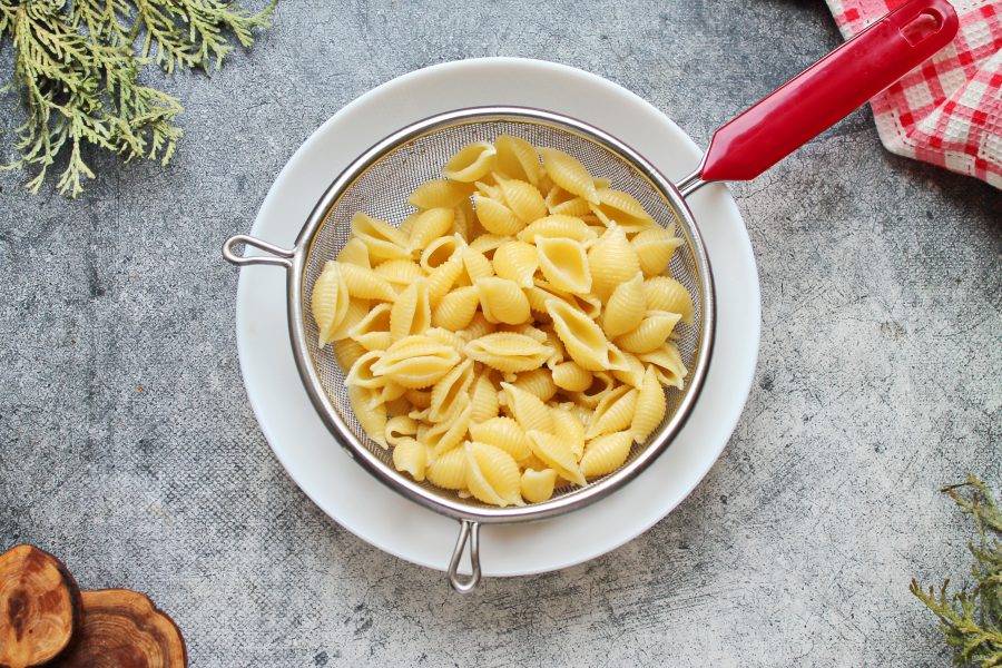 В кастрюлю налейте воду, посолите и доведите до кипения. Выложите макароны в воду и варите до готовности. Откиньте готовые макароны на сито и дайте воде полностью стечь.